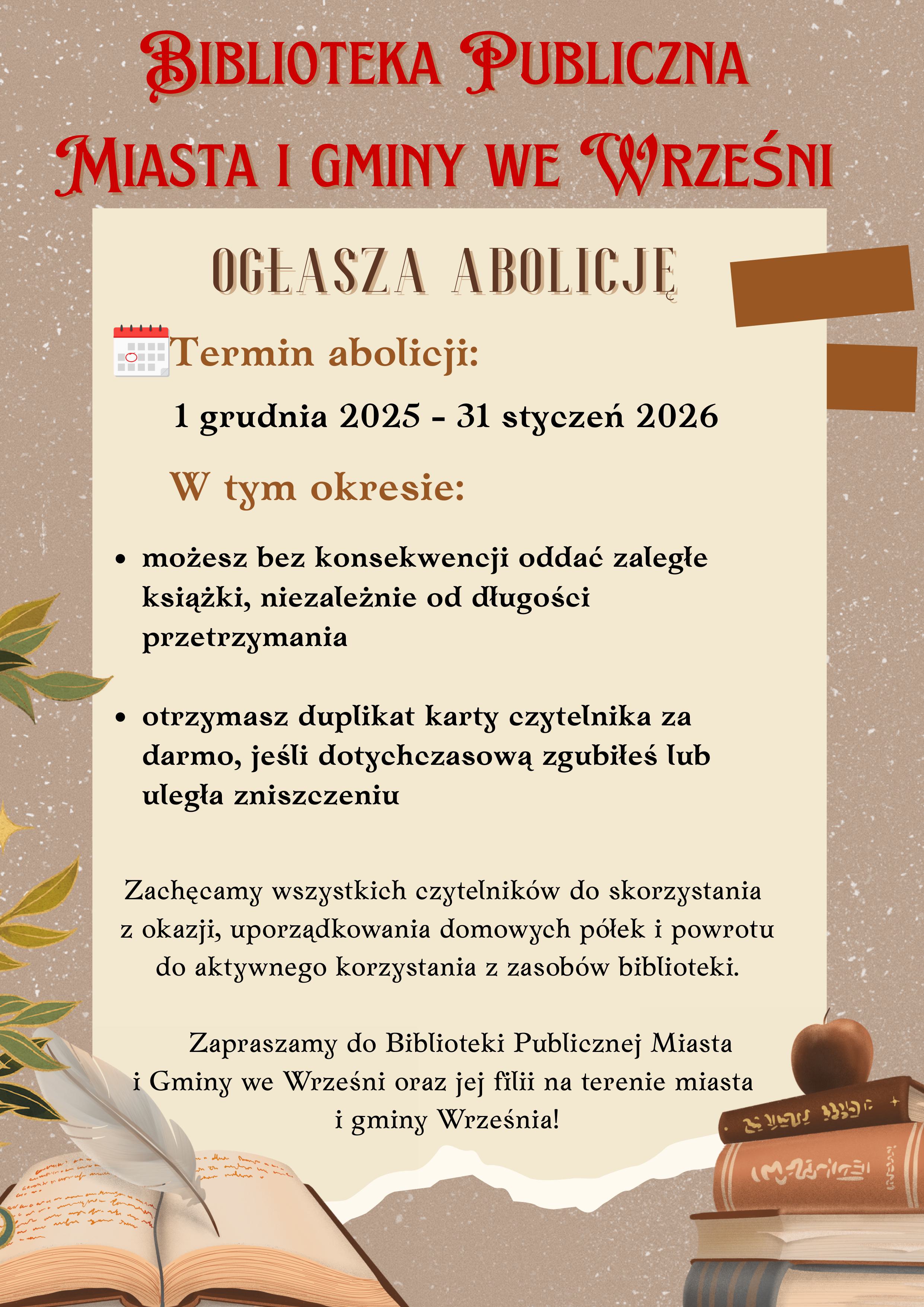 24 grudnia (wtorek) 2019 r. NIECZYNNE BIBLIOTEKA PUBLICZNA MIASTA I GMINY WE WRZEŚNI (BIBLIOTEKA GŁÓWNA - czytelnia, wypożyczalnia) oraz ODDZIAŁ DZIECIĘCY FILIA NR 1 FILIA W GRZYBOWIE FILIA W KACZANOWIE FILIA W NOWYM FOLWARKU FILIA W OTOCZNEJ